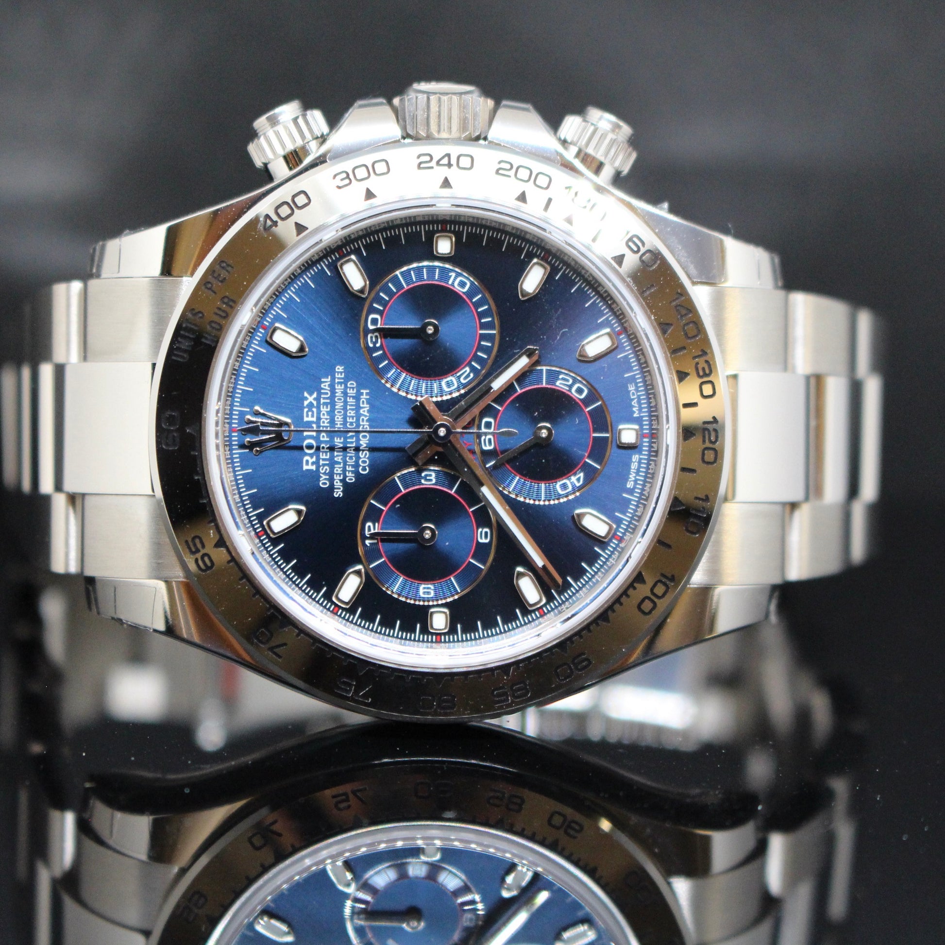 Rolex Daytona ref.116509, cassa in oro bianco, bracciale in oro bianco, quadrante blu, diametro cassa 40mm, movimento automatico, nuovo, completo di scatola e garanzia 2022 e garanzia gioielleria Cenciarini